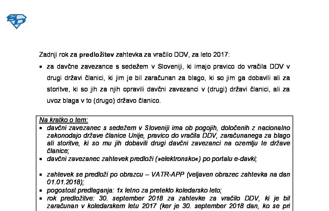 Predložitev zahtevka za vračilo DDV davčnemu zavezancu s sedežem v Sloveniji, ki ima pravico do vračila v drugi državi članici 2026-09-30 00:00:00