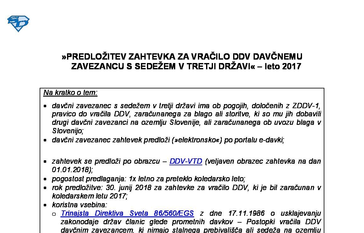 PREDLOŽITEV ZAHTEVKA ZA VRAČILO DDV DAVČNEMU ZAVEZANCU S SEDEŽEM V TRETJI DRŽAVI - leto 2024 27.01.2025