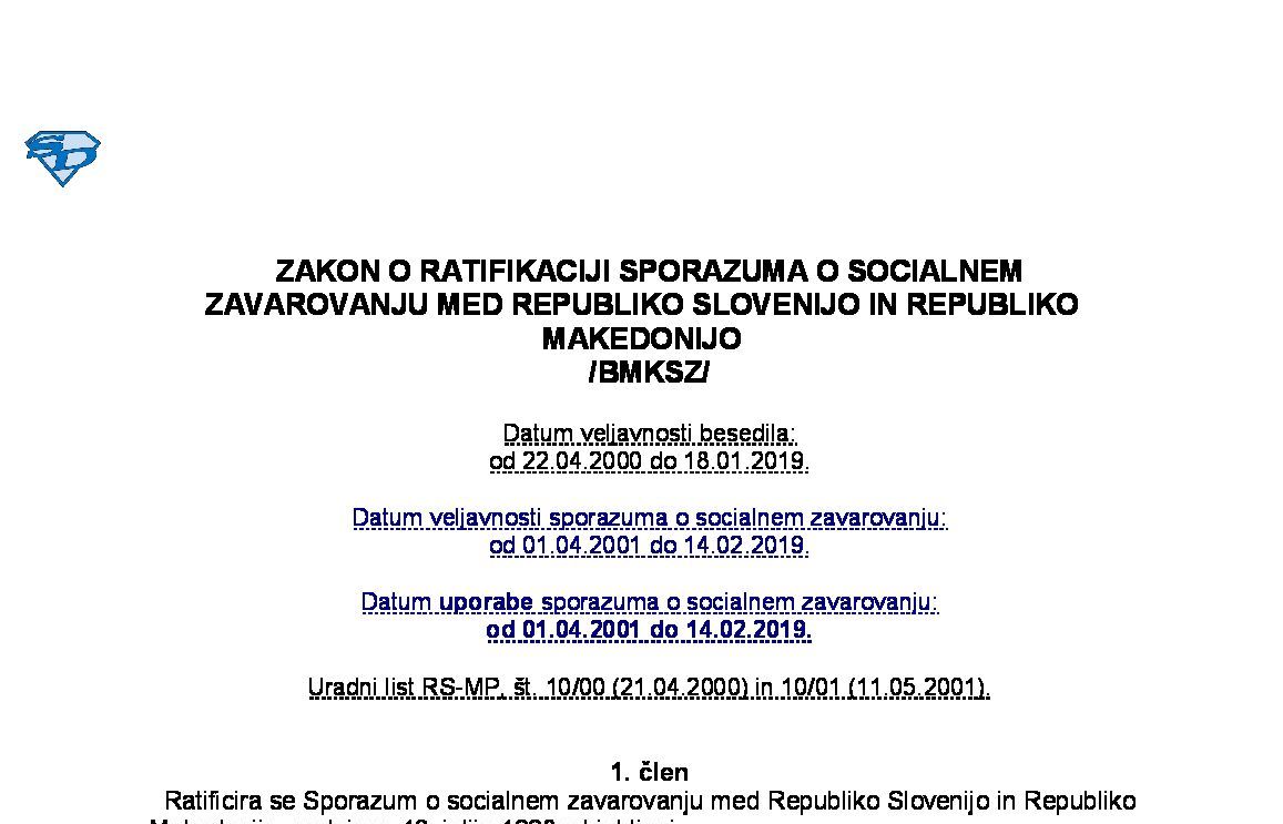 MAKEDONIJA - Sporazum o socialnem zavarovanju med Republiko Slovenijo in Republiko Makedonijo (BMKSZ - neuradno prečiščeno besedilo) 15.02.2019 [!] 27.03.2019