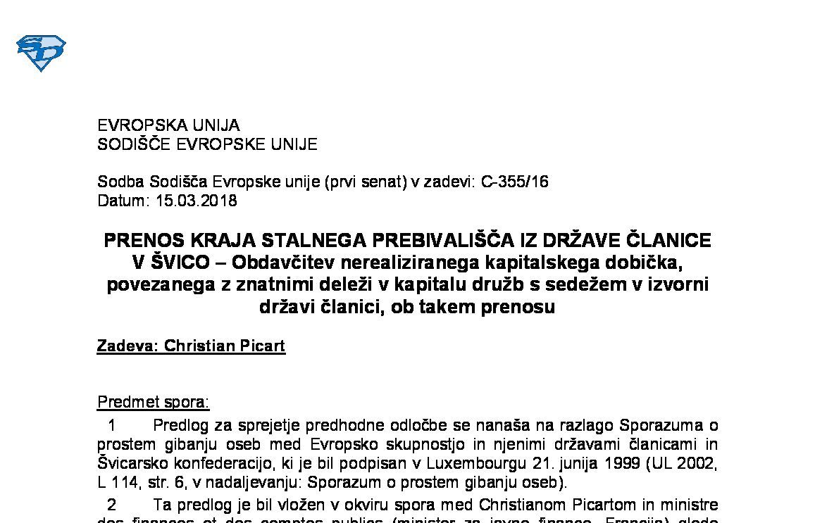 RAZMERJE MED SPORAZUMOM EU-ŠVICA IN DVOSTRANSKIMI KONVENCIJAMI O PREPREČEVANJU DVOJNEGA OBDAVČEVANJA – Obmejni delavci in diskriminacija na osnovi državljanstva (C-241/14) 19.11.2015 23.11.2015