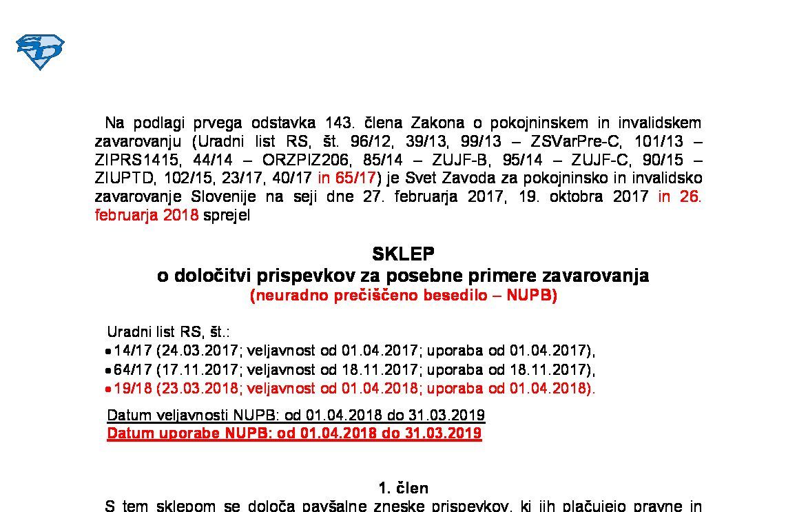 | Sklep o določitvi prispevkov za posebne primere zavarovanja (NUPB - neuradno prečiščeno besedilo) | 01.04.2025 | 12.03.2025 | ||