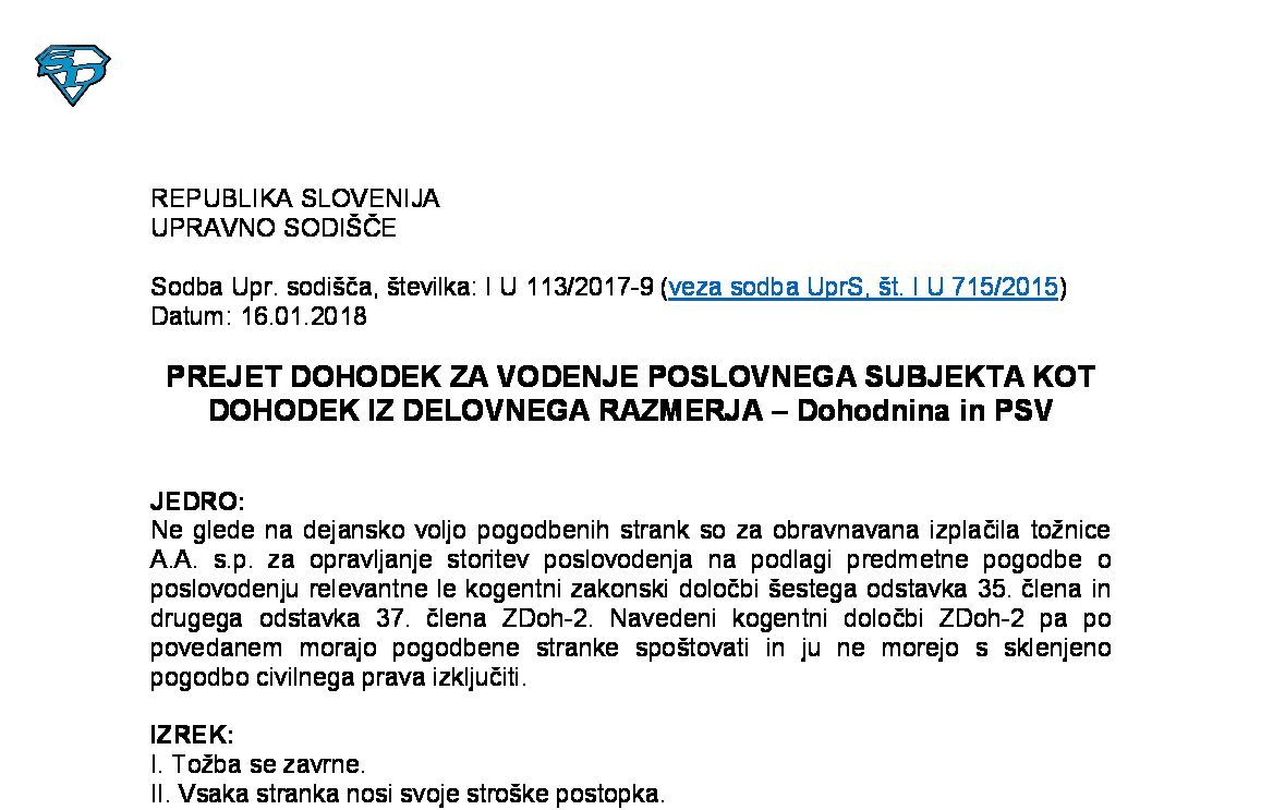 PREJEM POSLOVNEGA DELEŽA V DRUŽBI OB ANGAŽIRANJU PRI SANACIJI DRUŽBE – Darilo, ki se obdavčuje po ZDDD, ali dohodek obdavčen po ZDoh-2 (I U 1495/2022-13) 20.11.2024 10.07.2025