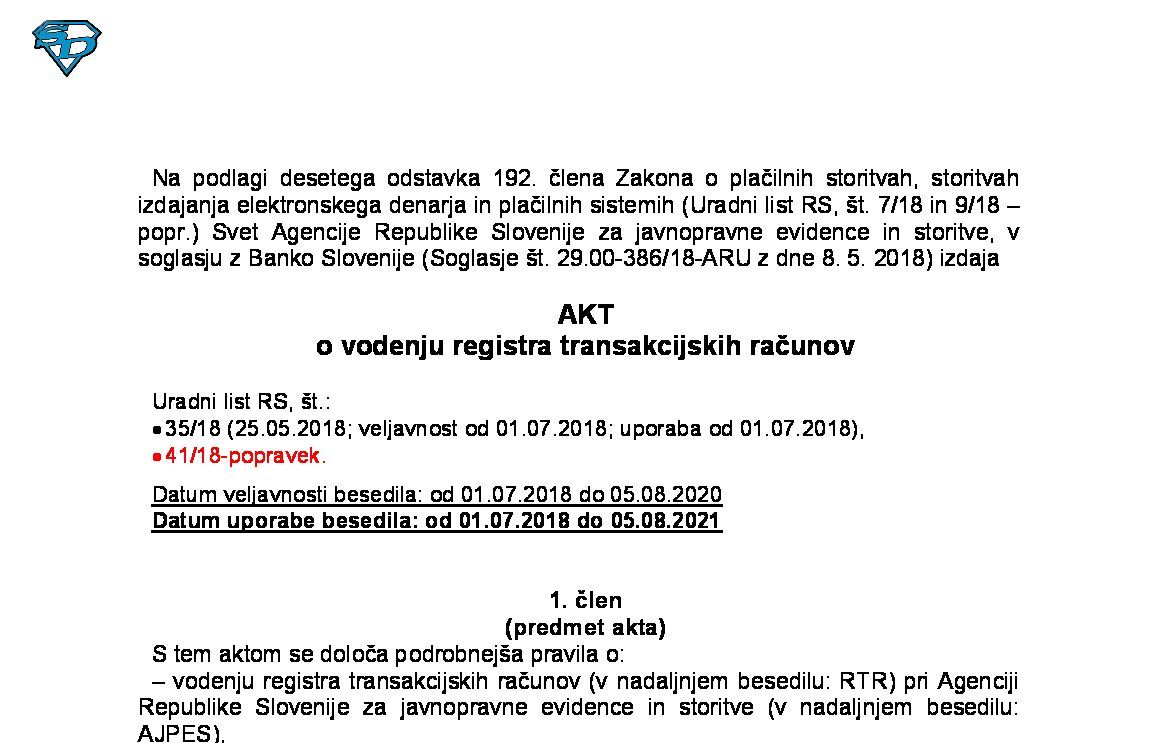 Akt o vzpostavitvi in vodenju registra transakcijskih računov (NUPB - neuradno prečiščeno besedilo) 18.09.2016 30.06.2018 13.09.2016