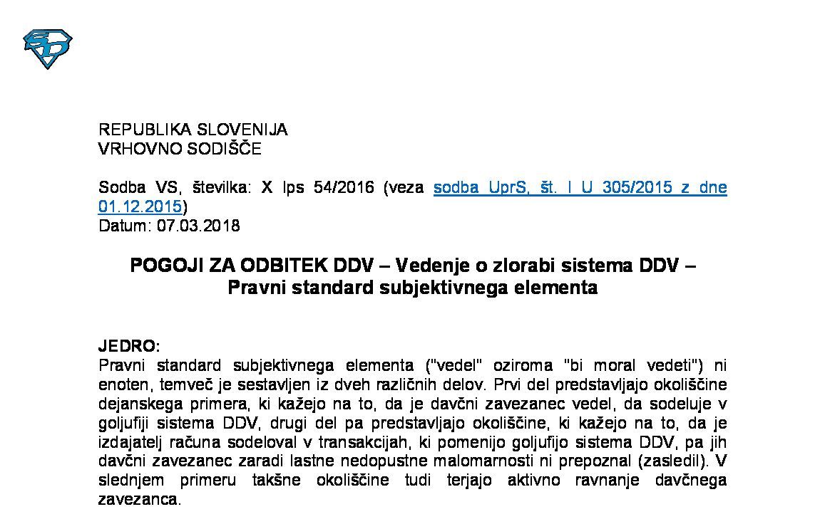 PRAVICA DO ODBITKA DDV – Dokazovanje obstoja goljufije na področju DDV s strani davčnega organa (X Ips 73/2021) 08.03.2023 13.06.2023
