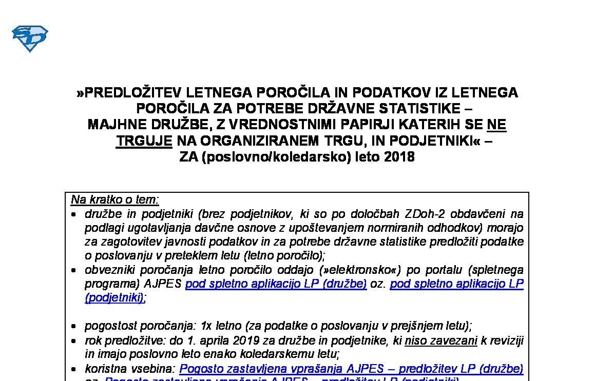 PREDLOŽITEV LETNEGA POROČILA IN PODATKOV IZ LETNEGA POROČILA ZA POTREBE DRŽAVNE STATISTIKE – MAJHNE DRUŽBE, Z VREDNOSTNIMI PAPIRJI KATERIH SE NE TRGUJE NA ORGANIZIRANEM TRGU, IN PODJETNIKI - ZA (poslovno/koledarsko) leto 2025 04.02.2026