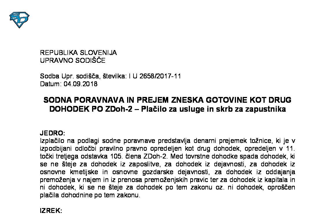 PREJEM POSLOVNEGA DELEŽA V DRUŽBI OB ANGAŽIRANJU PRI SANACIJI DRUŽBE – Darilo, ki se obdavčuje po ZDDD, ali dohodek obdavčen po ZDoh-2 (I U 1495/2022-13) 20.11.2024 10.07.2025