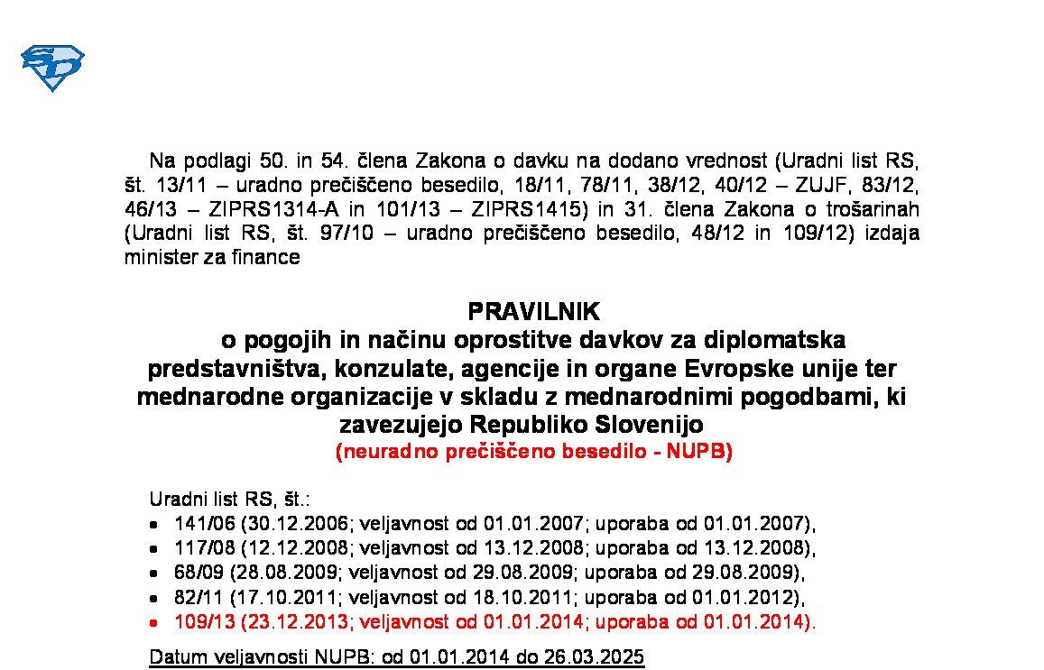 Pravilnik o pogojih in načinu oprostitve davkov za diplomatska predstavništva, konzulate, agencije in organe Evropske unije ter mednarodne organizacije v skladu z mednarodnimi pogodbami, ki zavezujejo Republiko Slovenijo 01.01.2026 03.11.2025