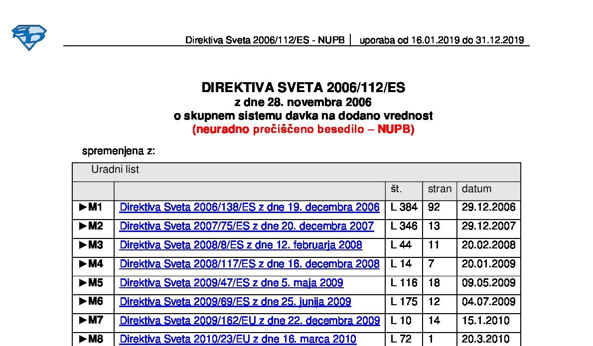 DIREKTIVA SVETA 2006/112/ES z dne 28.11.2006 o skupnem sistemu DDV (neuradno prečiščeno besedilo - NUPB) 01.01.2025 19.03.2025 20.01.2025