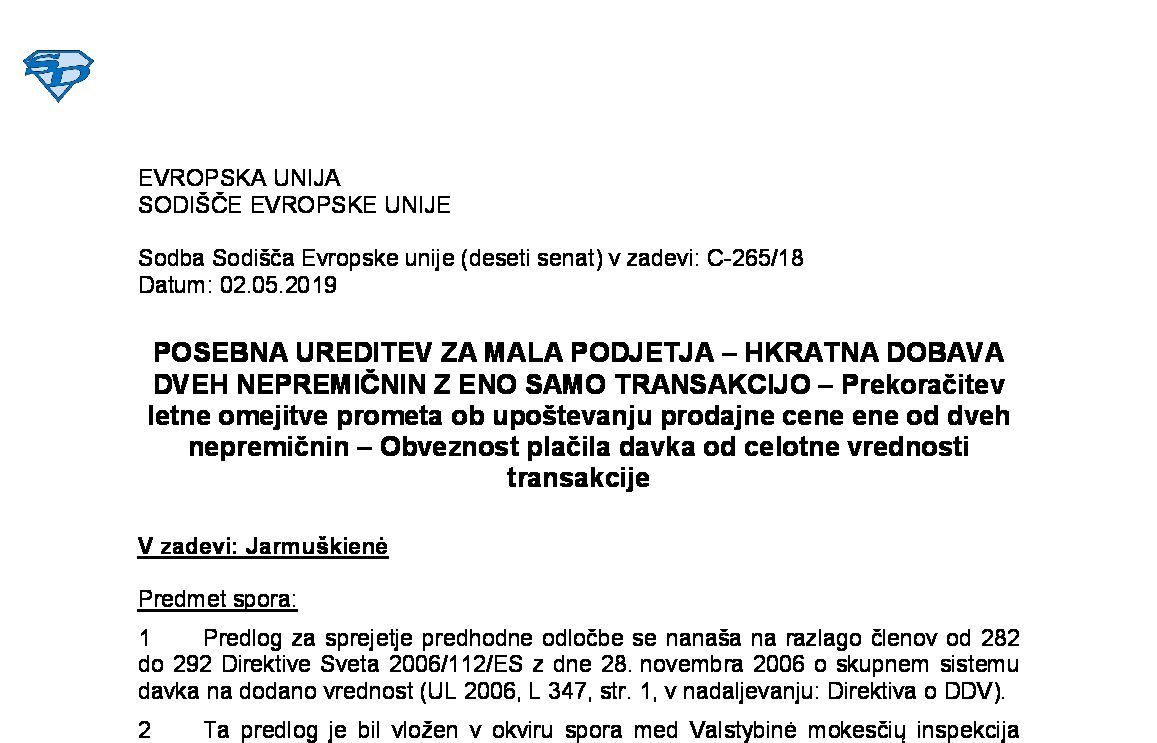 VRAČILO DDV DAVČNIM ZAVEZANCEM, KI NIMAJO SEDEŽA V DRŽAVI ČLANICI VRAČILA – GLAVNA IN POMOŽNA STORITEV – UMETNA DELITEV ENOTNE STORITVE – Neobstoj premestitve predmeta dobave (C-234/24) 23.10.2025 24.10.2025