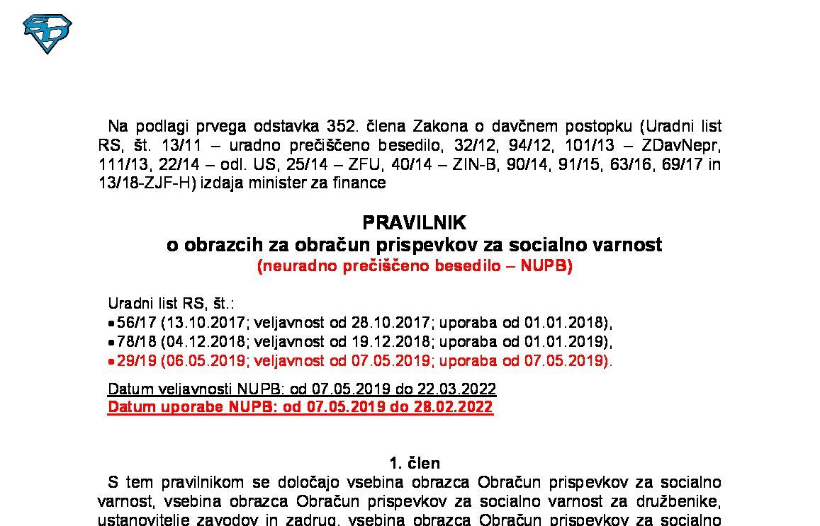 Pravilnik o obrazcih za obračun prispevkov za socialno varnost (neuradno prečiščeno besedilo - NUPB) 01.07.2025 27.05.2025