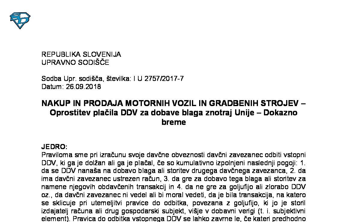 IZPOLNJEVANJE POGOJEV ZA DOBAVO BLAGA ZNOTRAJ UNIJE, OPROŠČENO PLAČILA DDV NA PODLAGI 46. ČLENA ZDDV-1 – Nepopolne CMR listine (I U 1704/2021-38) 27.11.2024 15.10.2025