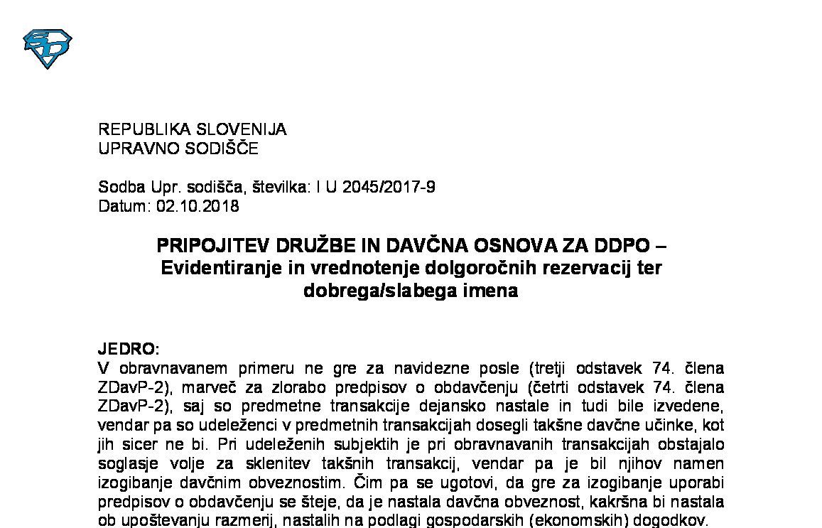 DDPO IN PREKLUZIJA DOKAZOV – Davčno priznan odhodek – Rezervacije – Prikrito izplačilo dobička (I U 652/2021-12) 15.07.2024 30.01.2025
