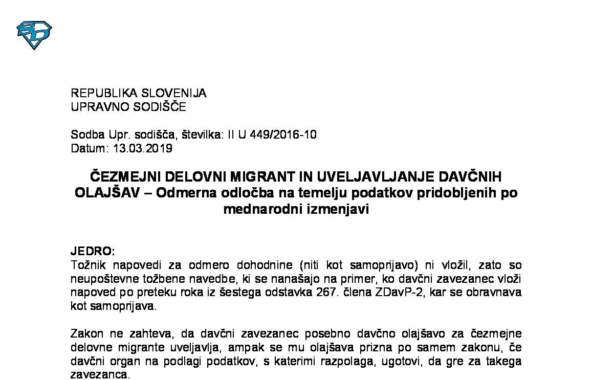 DOHODEK IZ DELOVNEGA RAZMERJA – Čezmejni delovni migrant – Stroški prehrane med delom (II U 195/2022-15) 30.09.2025 05.12.2025