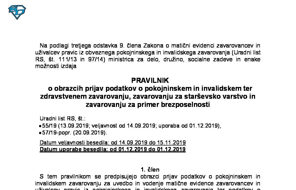 Pravilnik o obrazcih prijav podatkov o pokojninskem in invalidskem ter zdravstvenem zavarovanju, zavarovanju za starševsko varstvo in zavarovanju za primer brezposelnosti ('M-obrazci' - neuradno prečiščeno besedilo) 01.01.2026 05.01.2026