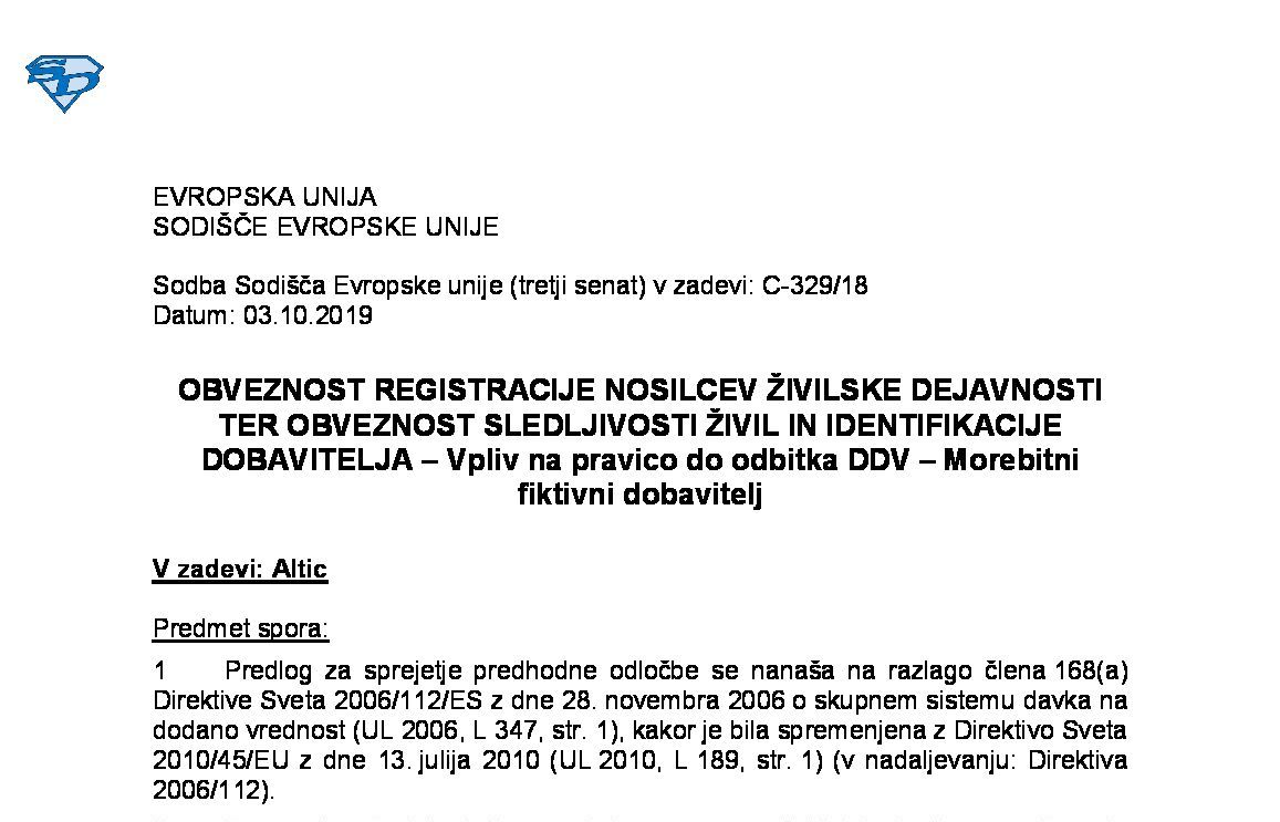 VRAČILO DDV DAVČNIM ZAVEZANCEM, KI NIMAJO SEDEŽA V DRŽAVI ČLANICI VRAČILA – GLAVNA IN POMOŽNA STORITEV – UMETNA DELITEV ENOTNE STORITVE – Neobstoj premestitve predmeta dobave (C-234/24) 23.10.2025 24.10.2025