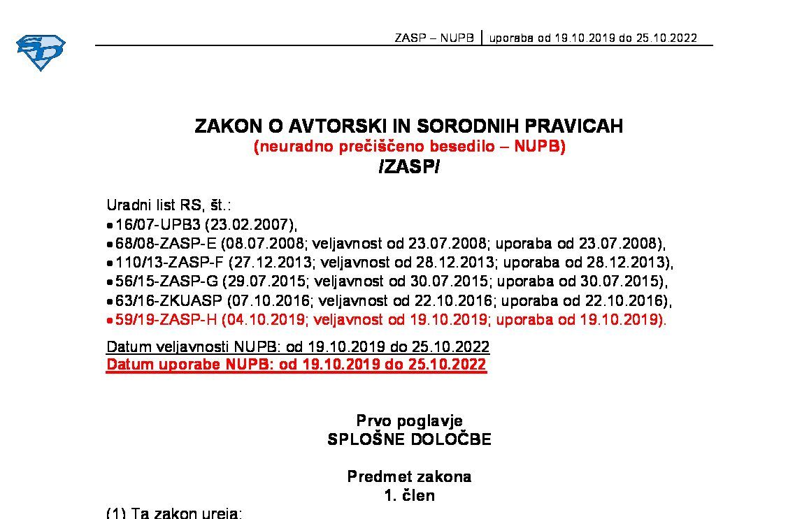 ZAKON O AVTORSKI IN SORODNIH PRAVICAH (ZASP - neuradno prečiščeno besedilo) 26.10.2022 [!] 12.10.2022