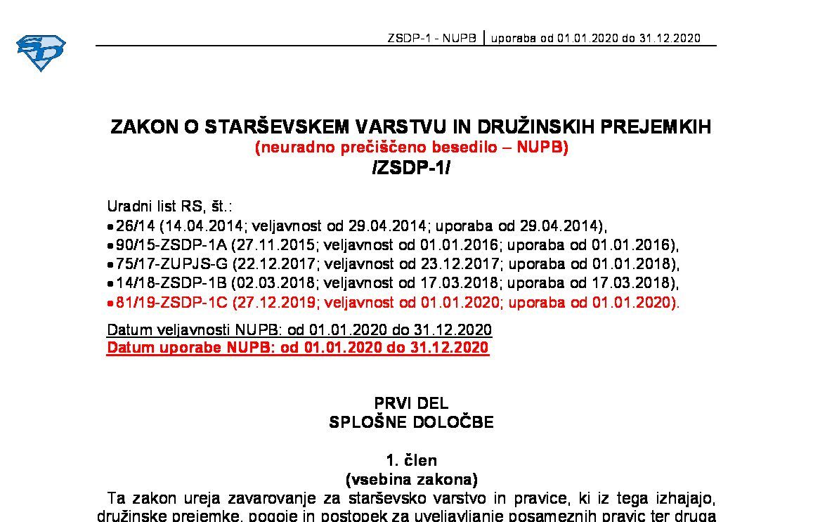 ZAKON O STARŠEVSKEM VARSTVU IN DRUŽINSKIH PREJEMKIH (ZSDP-1 - neuradno prečiščeno besedilo) 01.01.2021 [!] 30.06.2021 04.11.2020