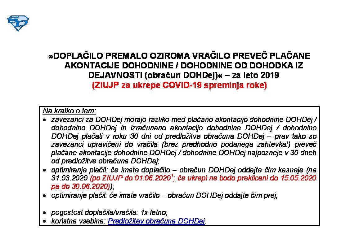 PLAČEVANJE PREDHODNE AKONTACIJE DOHODNINE / AKONTACIJE DOHODNINE OD DOHODKA IZ DEJAVNOSTI (obračun DOHDej) – v letu 2026 12.12.2025