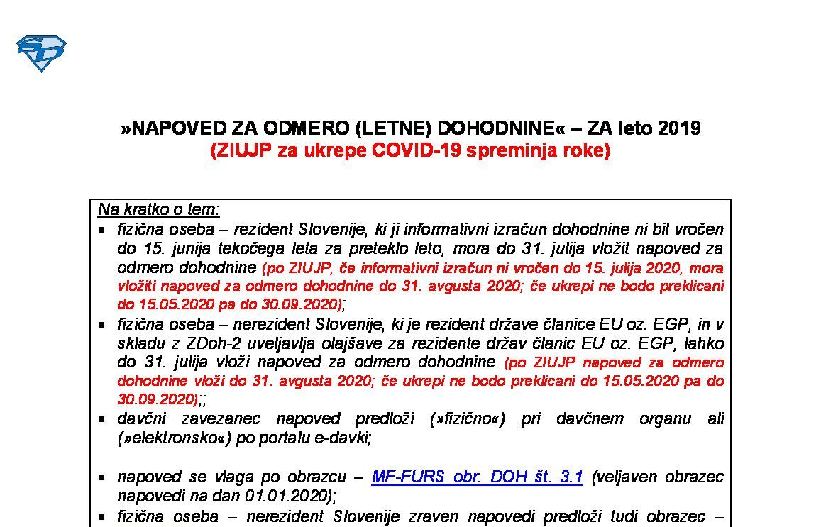 NAPOVED ZA ODMERO (LETNE) DOHODNINE – ZA leto 2025 21.01.2026