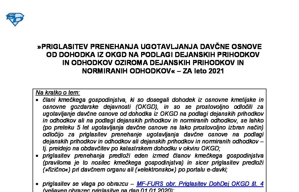 VLOGA ZA UVELJAVLJANJE POSEBNE OLAJŠAVE ZA INVESTIRANJE V OSNOVNO KMETIJSKO IN OSNOVNO GOZDARSKO DEJAVNOST - ZA leto 2025 21.01.2026