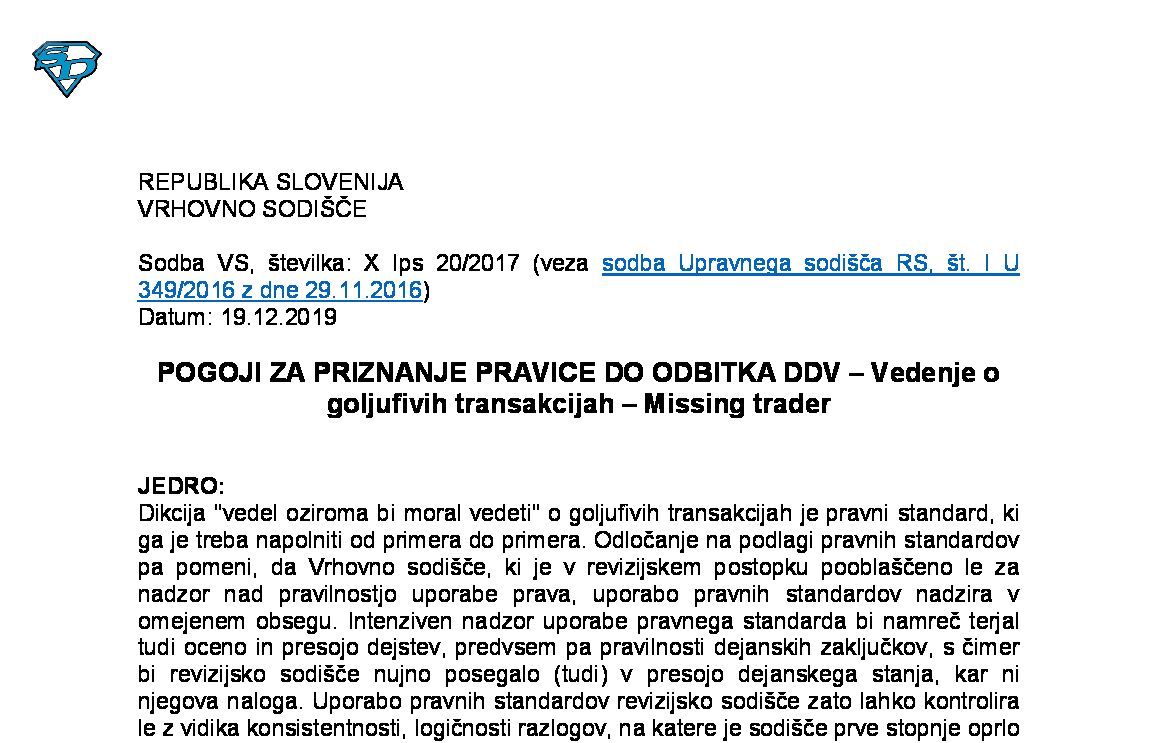 PRAVICA DO ODBITKA DDV – Dokazovanje obstoja goljufije na področju DDV s strani davčnega organa (X Ips 73/2021) 08.03.2023 13.06.2023