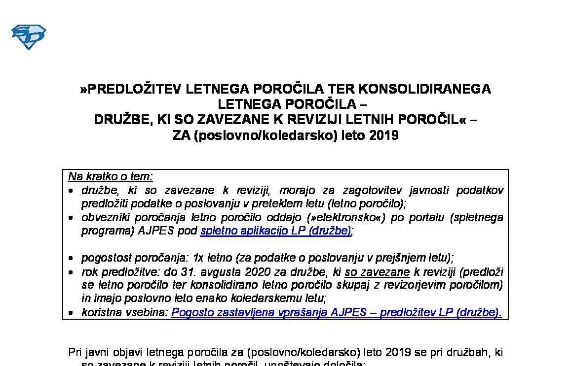 PREDLOŽITEV LETNEGA POROČILA TER KONSOLIDIRANEGA LETNEGA POROČILA IN PODATKOV IZ LETNEGA POROČILA ZA POTREBE DRŽAVNE STATISTIKE – DRUŽBE, KI SO ZAVEZANE K REVIZIJI LETNIH POROČIL - ZA (poslovno/koledarsko) leto 2024 31.01.2025