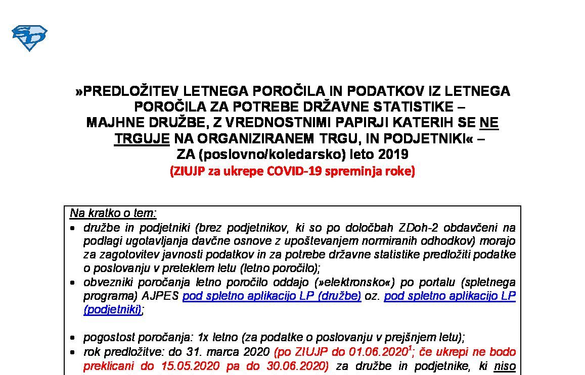 PREDLOŽITEV LETNEGA POROČILA IN PODATKOV IZ LETNEGA POROČILA ZA POTREBE DRŽAVNE STATISTIKE – MAJHNE DRUŽBE, Z VREDNOSTNIMI PAPIRJI KATERIH SE NE TRGUJE NA ORGANIZIRANEM TRGU, IN PODJETNIKI - ZA (poslovno/koledarsko) leto 2024 31.01.2025