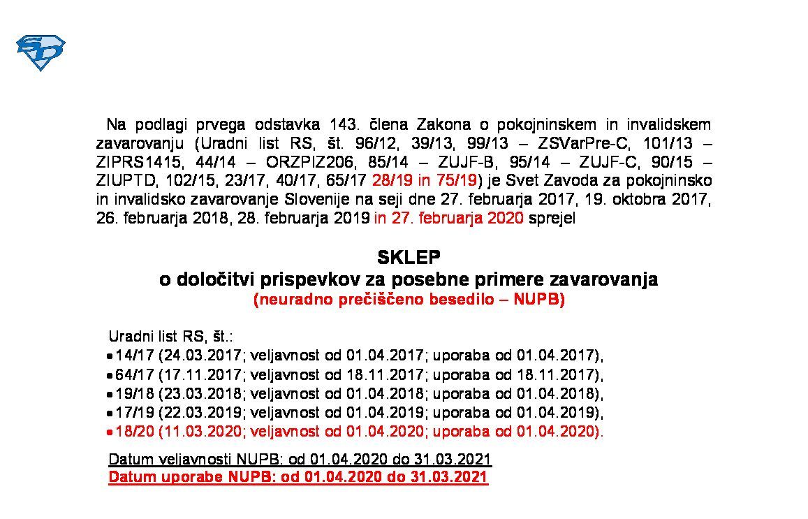 | Sklep o določitvi prispevkov za posebne primere zavarovanja (NUPB - neuradno prečiščeno besedilo) | 01.04.2025 | 12.03.2025 | ||