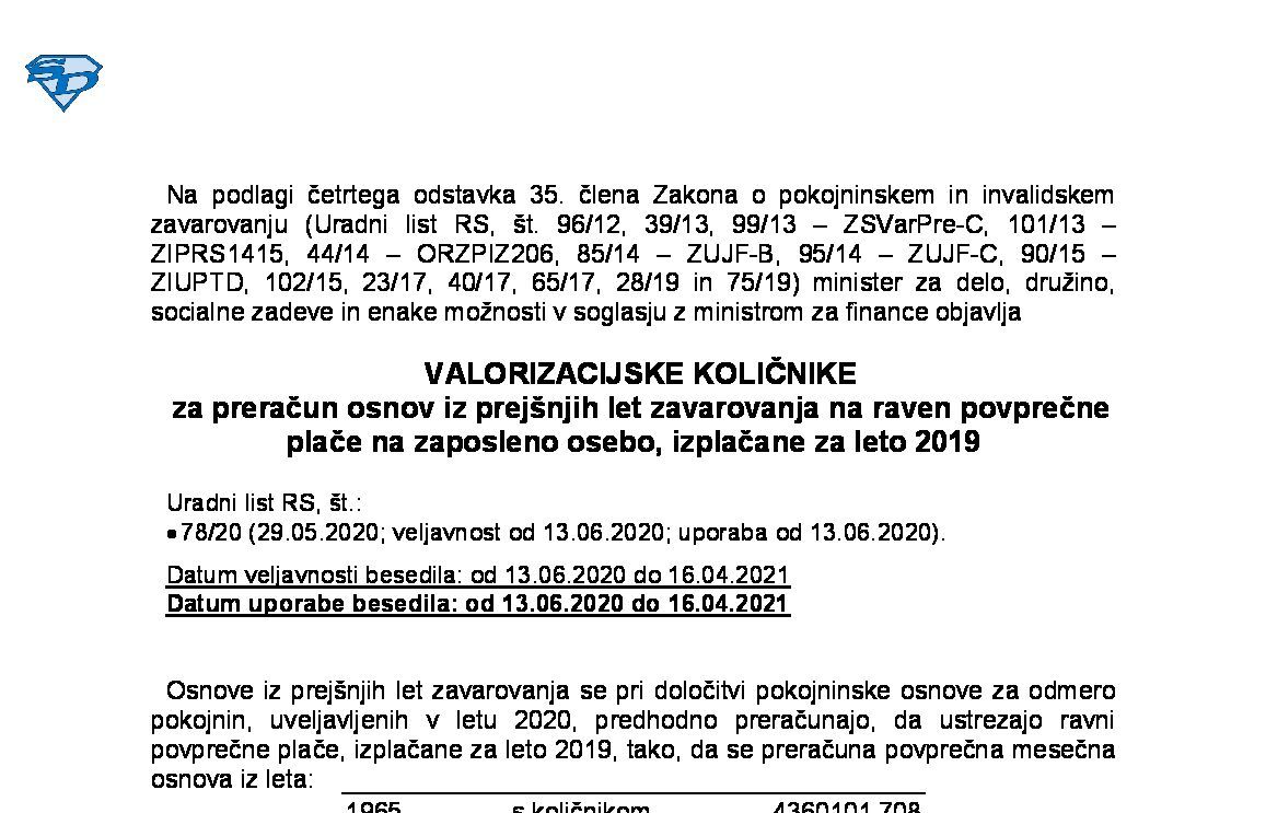 | Valorizacijski količniki za preračun osnov iz prejšnjih let zavarovanja na raven povprečne plače na zaposleno osebo, izplačane za leto 2024 | 09.04.2025 | [!] | 27.03.2025 | |