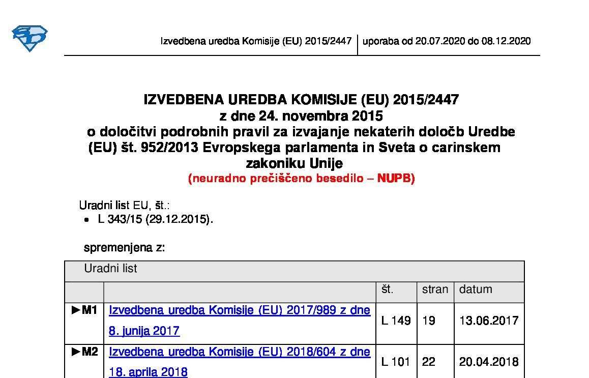 IZVEDBENA UREDBA KOMISIJE (EU) 2015/2447 z dne 24. novembra 2015 o določitvi podrobnih pravil za izvajanje nekaterih določb Uredbe (EU) št. 952/2013 Evropskega parlamenta in Sveta o carinskem zakoniku Unije 01.12.2027 17.04.2024