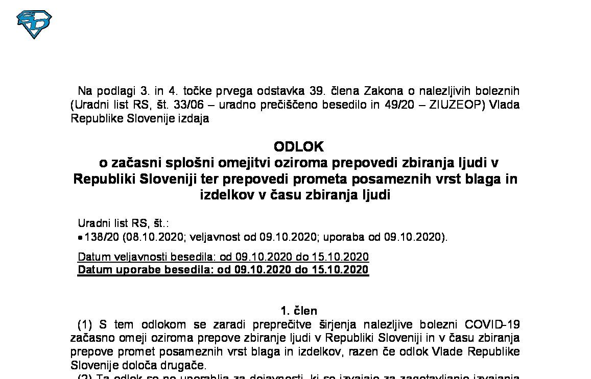 Sklep o uporabi ukrepov, ki jih določa Zakon o nalezljivih boleznih, pri nalezljivi bolezni COVID-19 04.09.2020 04.09.2020