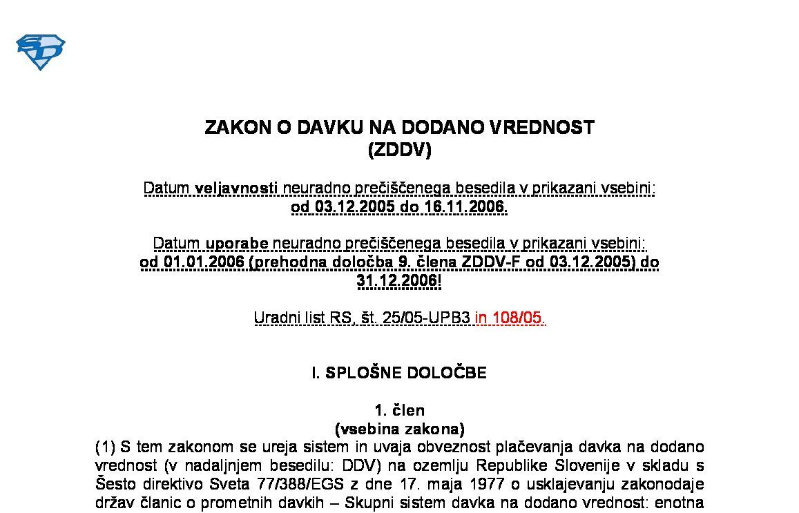 ZAKON O DAVKU NA DODANO VREDNOST (ZDDV-1 - neuradno prečiščeno besedilo) 06.12.2023 [!] 31.12.2023 05.12.2023