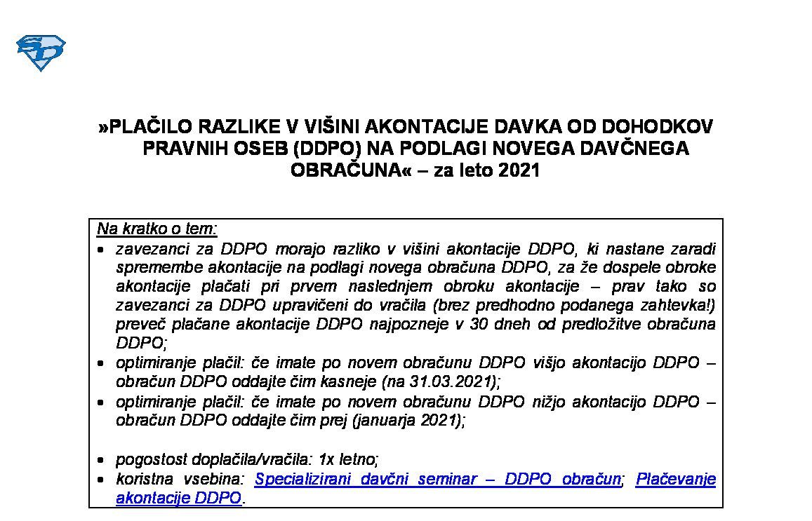 PLAČILO RAZLIKE V VIŠINI AKONTACIJE DAVKA OD DOHODKOV PRAVNIH OSEB NA PODLAGI NOVEGA DAVČNEGA OBRAČUNA (DDPO) - za leto 2026 11.12.2025