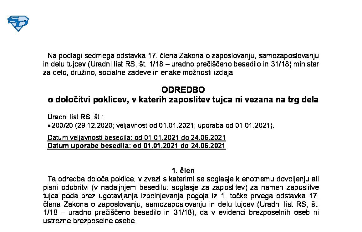Odredba o določitvi poklicev, v katerih zaposlitev tujca ni vezana na trg dela (NUPB - neuradno prečiščeno besedilo) 01.07.2025 31.12.2025 01.07.2025