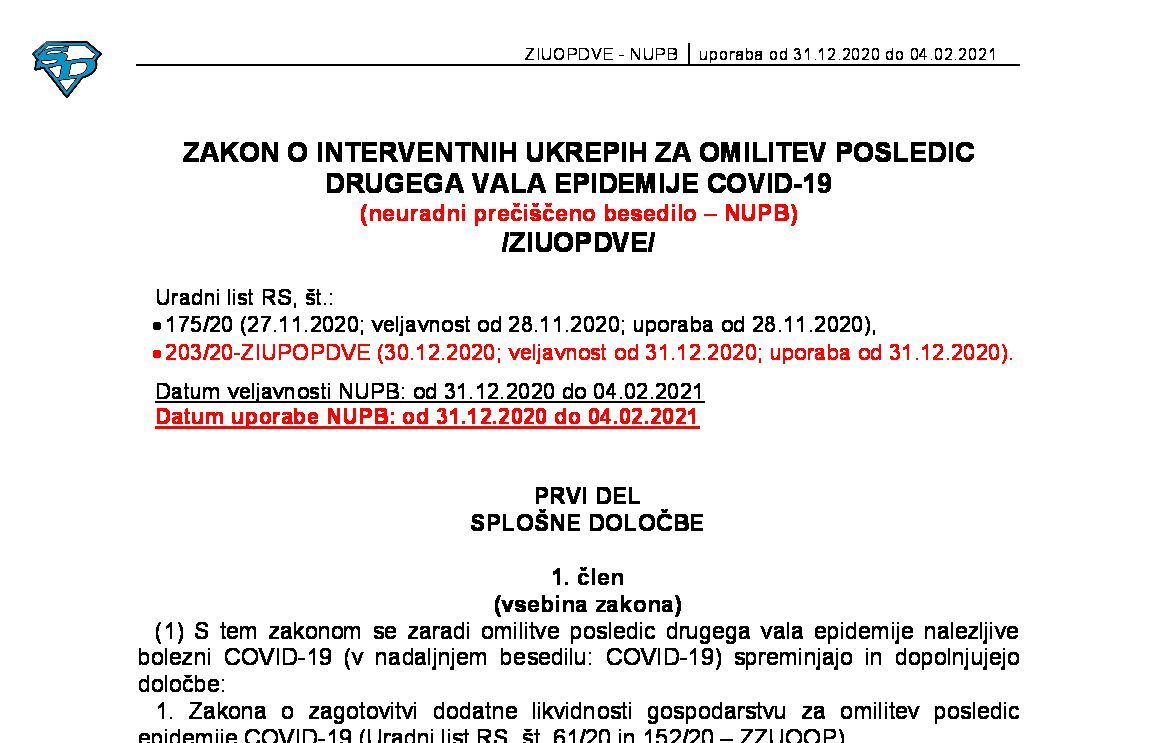 | ZAKON O INTERVENTNIH UKREPIH ZA POMOČ PRI OMILITVI POSLEDIC DRUGEGA VALA EPIDEMIJE COVID-19 (ZIUPOPDVE - neuradno prečiščeno besedilo) | 01.01.2023 | 30.12.2023 | 20.12.2022 | |