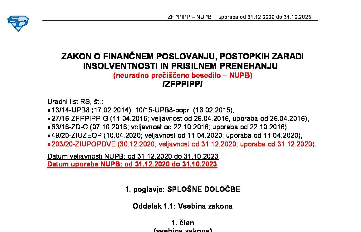 | ZAKON O FINANČNEM POSLOVANJU, POSTOPKIH ZARADI INSOLVENTNOSTI IN PRISILNEM PRENEHANJU (ZFPPIPP - neuradno prečiščeno besedilo) | 01.11.2023 | [!] | 18.06.2025 | 09.10.2023 |