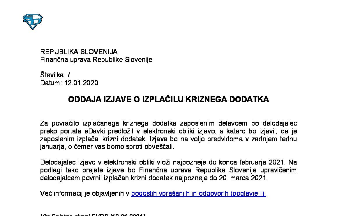 PRIPRAVA IN DOSTAVA PODATKOV o izplačanih dodatkih, ki se v skladu z 59. členom ZIUPOPDVE ter 55. členom ZDUPŠOP ne vštevajo v davčno osnovo za letno odmero dohodnine za odmerno leto 2021 (podrobnejši opis, 3. izdaja) 03.01.2022 05.01.2022
