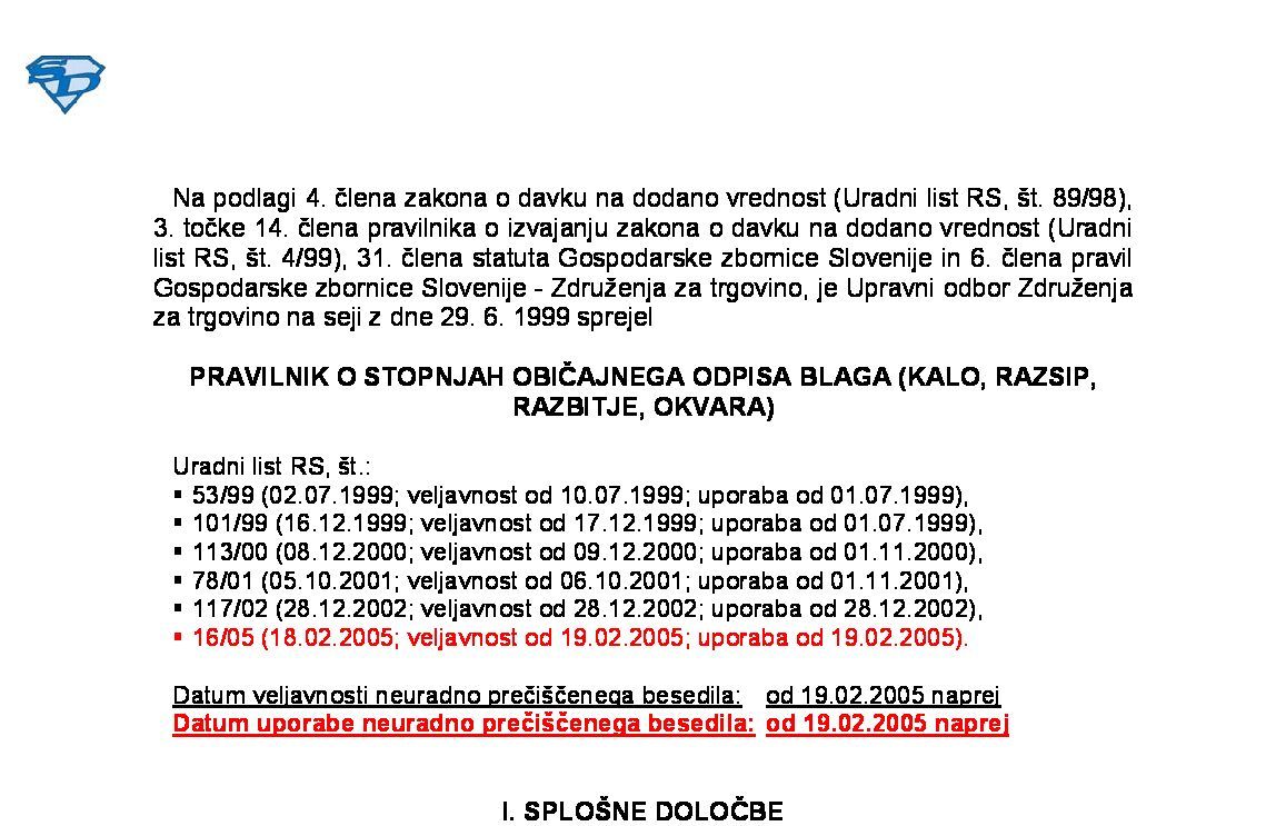Pravilnik o stopnjah običajnega odpisa, primanjkljaja blaga in remitende (kalo, razbitje in okvara nosilcev besede, slike, zvoka) - GZS-ZKGM (neuradno prečiščeno besedilo) 01.01.2009 17.03.2009