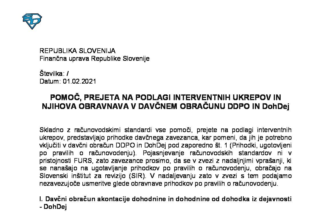 POMOČ, PREJETA NA PODLAGI INTERVENTNIH UKREPOV IN NJIHOVA OBRAVNAVA V DAVČNEM OBRAČUNU ZA LETO 2021 11.02.2022 11.02.2022