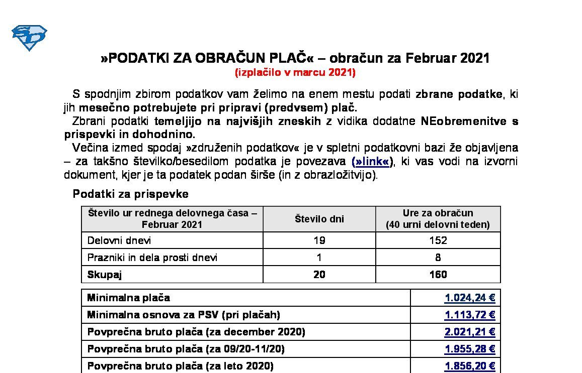 Za izplačilo plače za mesec februar 2021, ki se izplača v marcu 2021, se za izračun minimalne zavarovalne osnove (ZOmin) uporabi znesek povprečne plače leta 2020 = 1.856,20 € x 0,60 % = 1.113,72 €.