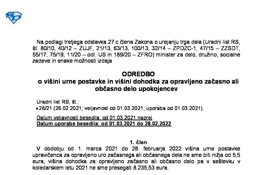 Odredba o višini urne postavke in višini dohodka za opravljeno začasno ali občasno delo upokojencev (NUPB - neuradno prečiščeno besedilo) 08.11.2025 28.02.2026 10.11.2025