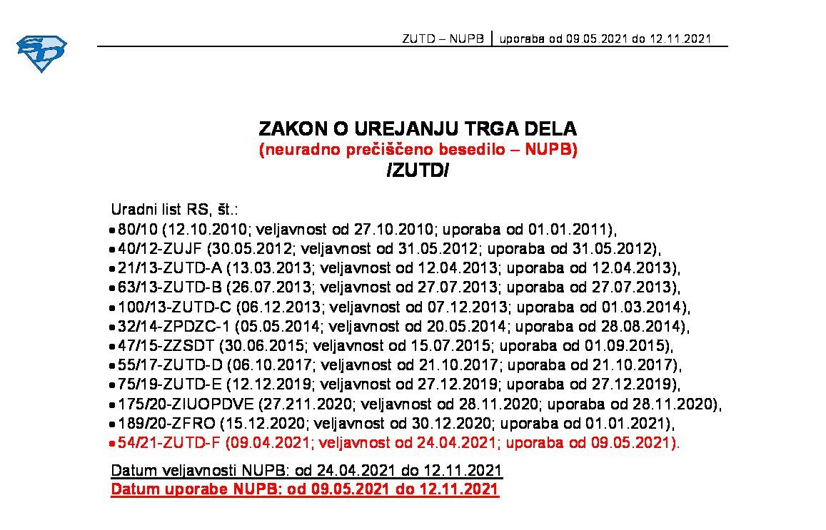 ZAKON O UREJANJU TRGA DELA (ZUTD - neuradno prečiščeno besedilo) 20.09.2025 [!] 28.10.2025 23.09.2025