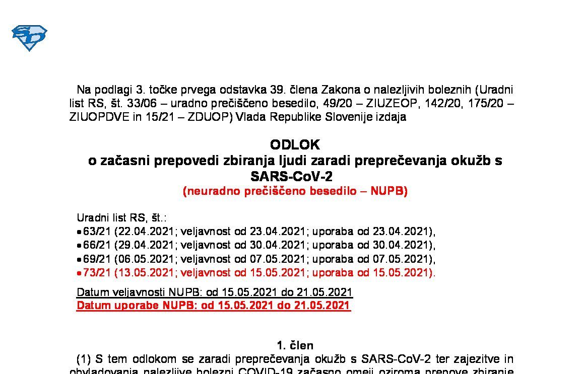 Odlok o začasnih ukrepih za preprečevanje in obvladovanje okužb z nalezljivo boleznijo COVID-19 14.05.2022 30.05.2022 17.05.2022