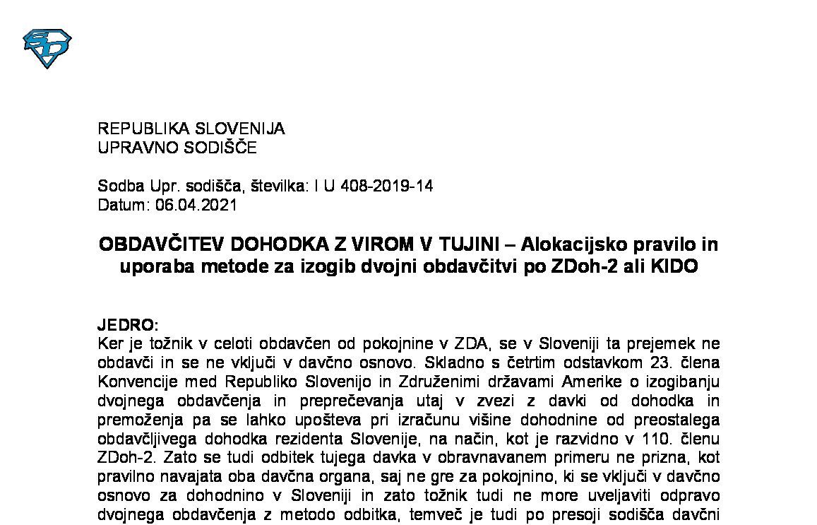 UGOTAVLJANJE REZIDENTSKEGA STATUSA – Dvojno rezidentstvo – Rezidentstvo po KIDO in po ZDoh-2 ( I U 609/2021-7) 17.05.2024 10.06.2025