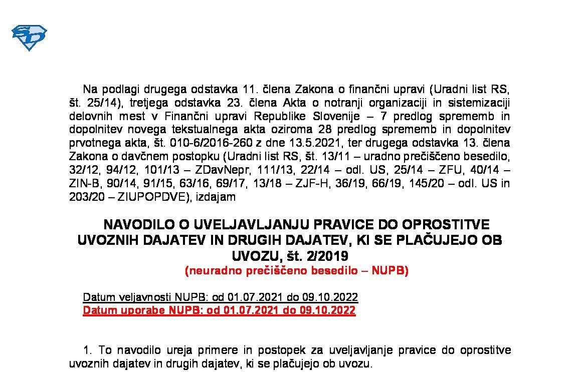 NAVODILO o formalnostih, vezanih na plačevanje uvoznega DDV, št. 13/2016 01.09.2025 28.08.2025
