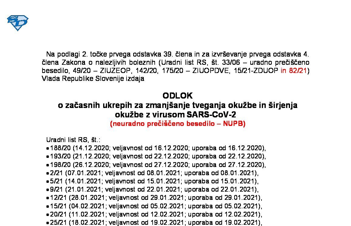 Odlok o začasnih ukrepih za preprečevanje in obvladovanje okužb z nalezljivo boleznijo COVID-19 14.05.2022 30.05.2022 17.05.2022