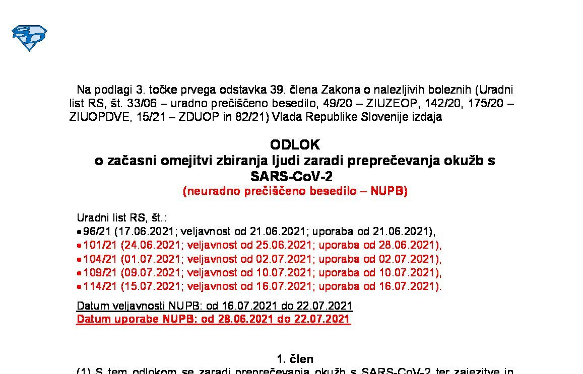 Odlok o začasnih ukrepih za preprečevanje in obvladovanje okužb z nalezljivo boleznijo COVID-19 14.05.2022 30.05.2022 17.05.2022