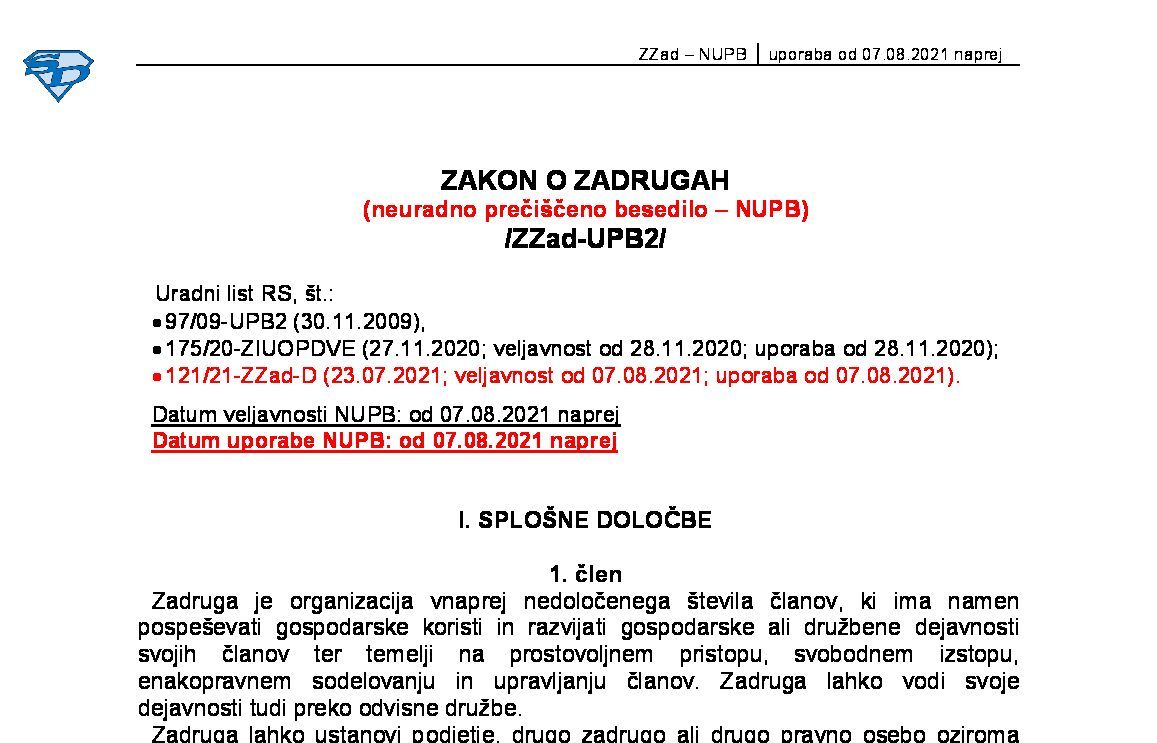 | ZAKON O ZADRUGAH (ZZad - neuradno prečiščeno besedilo) | 28.11.2020 | [!] | 06.08.2021 | 15.12.2020 |