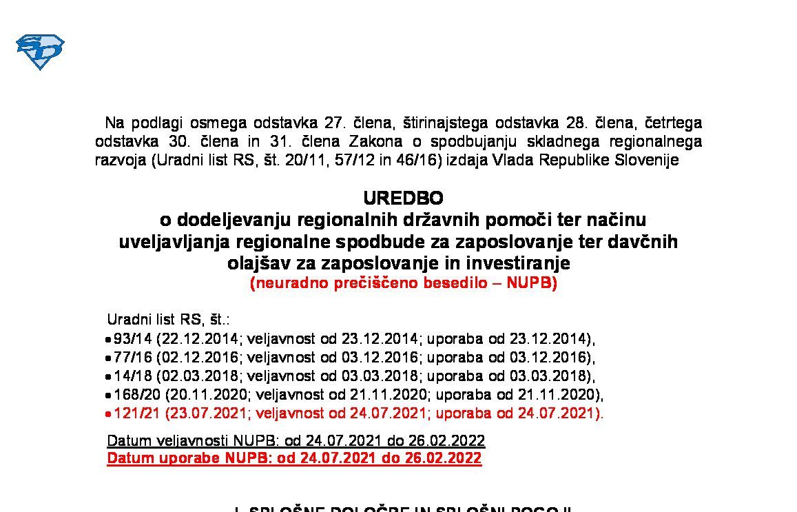 | Uredba o dodeljevanju regionalnih državnih pomoči ter načinu uveljavljanja regionalne spodbude za zaposlovanje ter davčnih olajšav za zaposlovanje in investiranje (NUPB - neuradno prečiščeno besedilo) | 27.07.2024 | 30.07.2024 | ||