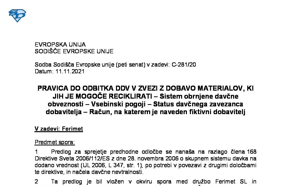 VRAČILO DDV DAVČNIM ZAVEZANCEM, KI NIMAJO SEDEŽA V DRŽAVI ČLANICI VRAČILA – GLAVNA IN POMOŽNA STORITEV – UMETNA DELITEV ENOTNE STORITVE – Neobstoj premestitve predmeta dobave (C-234/24) 23.10.2025 24.10.2025